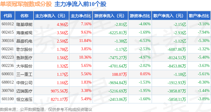 资金流向方面,单项冠军(980150)指数成份股当日主力资金净流出合计88.23亿元,游资资金净流入合计21.41亿元,散户资金净流入合计66.81亿元。成份股资金流向详情见下表: