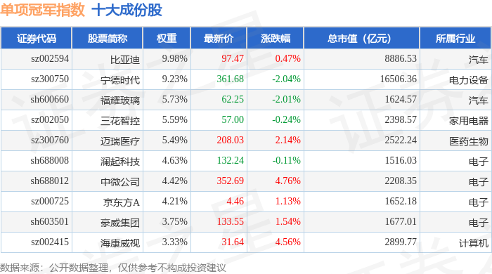 单项冠军(980150)指数十大成份股详情如下: