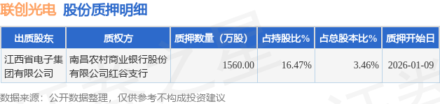 证券之星消息,联创光电(600363)1月12日公开信息显示,股东江西省电子集团有限公司向南昌农村商业银行股份有限公司红谷支行合计质押1560.0万股,占总股本3.46%。质押详情见下表: