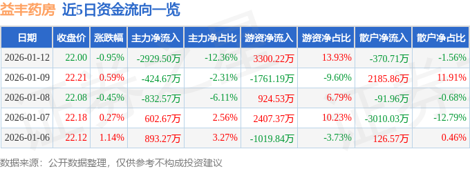 证券之星消息,截至2026年1月12日收盘,益丰药房(603939)报收于22.0元,下跌0.95%,换手率0.88%,成交量10.69万手,成交额2.37亿元。