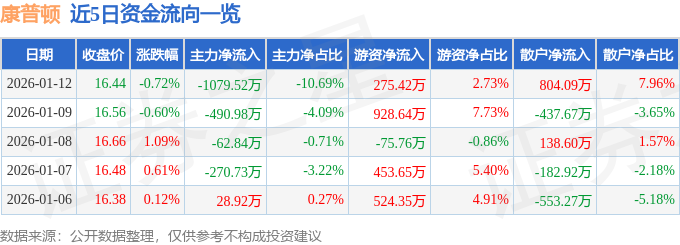 证券之星消息,截至2026年1月12日收盘,康普顿(603798)报收于16.44元,下跌0.72%,换手率2.4%,成交量6.15万手,成交额1.01亿元。