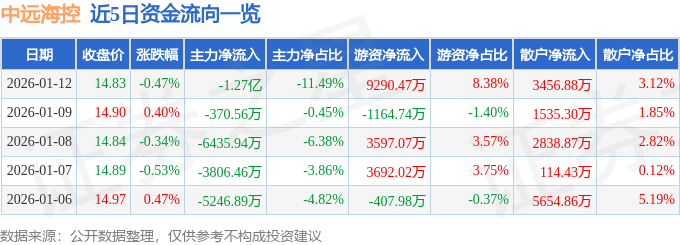 证券之星消息,截至2026年1月12日收盘,中远海控(601919)报收于14.83元,下跌0.47%,换手率0.59%,成交量74.87万手,成交额11.09亿元。