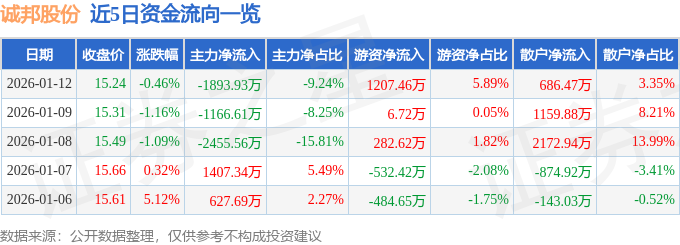 证券之星消息,截至2026年1月12日收盘,诚邦股份(603316)报收于15.24元,下跌0.46%,换手率5.04%,成交量13.33万手,成交额2.05亿元。