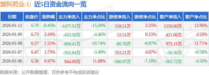 证券之星消息,截至2026年1月12日收盘,盟科药业(688373)报收于6.7元,下跌0.45%,换手率2.4%,成交量14.51万手,成交额9718.25万元。