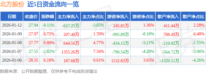 1月12日的资金流向数据方面,主力资金净流出657.25万元,占总成交额3.65%,游资资金净流入245.81万元,占总成交额1.36%,散户资金净流入411.44万元,占总成交额2.28%。