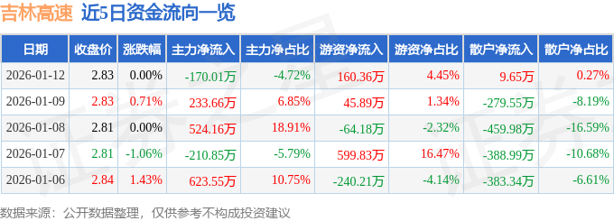 证券之星消息,截至2026年1月12日收盘,吉林高速(601518)报收于2.83元,上涨0.0%,换手率0.68%,成交量12.76万手,成交额3604.39万元。