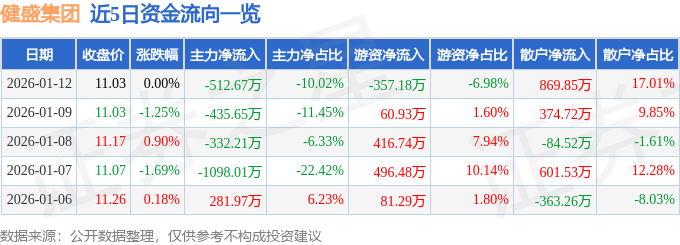 1月12日的资金流向数据方面,主力资金净流出512.67万元,占总成交额10.02%,游资资金净流出357.18万元,占总成交额6.98%,散户资金净流入869.85万元,占总成交额17.01%。
