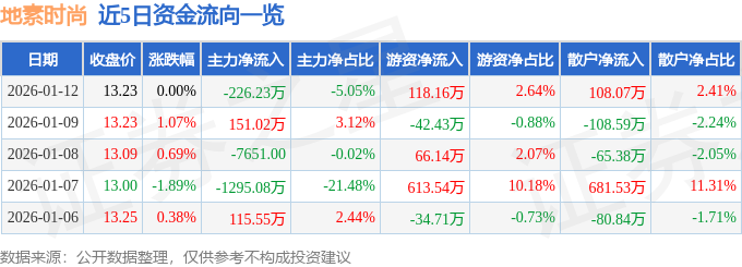 1月12日的资金流向数据方面,主力资金净流出226.23万元,占总成交额5.05%,游资资金净流入118.16万元,占总成交额2.64%,散户资金净流入108.07万元,占总成交额2.41%。