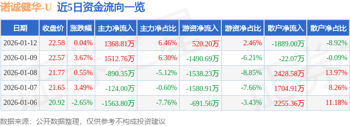 1月12日的资金流向数据方面,主力资金净流入1368.81万元,占总成交额6.46%,游资资金净流入520.2万元,占总成交额2.46%,散户资金净流出1889.0万元,占总成交额8.92%。