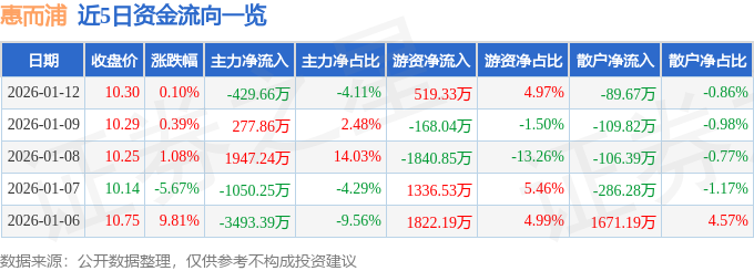 1月12日的资金流向数据方面,主力资金净流出429.66万元,占总成交额4.11%,游资资金净流入519.33万元,占总成交额4.97%,散户资金净流出89.67万元,占总成交额0.86%。