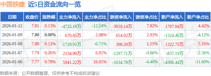 证券之星消息,截至2026年1月12日收盘,中国铁建(601186)报收于7.81元,上涨0.13%,换手率0.43%,成交量49.48万手,成交额3.86亿元。
