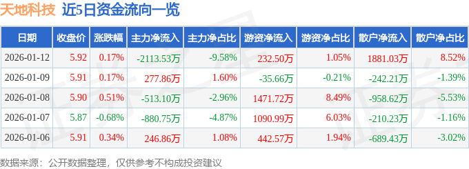 证券之星消息,截至2026年1月12日收盘,天地科技(600582)报收于5.92元,上涨0.17%,换手率0.9%,成交量37.39万手,成交额2.21亿元。