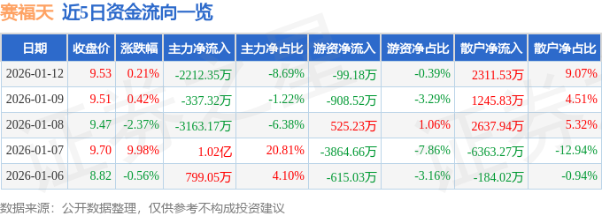证券之星消息,截至2026年1月12日收盘,赛福天(603028)报收于9.53元,上涨0.21%,换手率9.41%,成交量26.75万手,成交额2.55亿元。