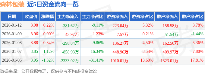 证券之星消息,截至2026年1月12日收盘,森林包装(605500)报收于8.98元,上涨0.22%,换手率1.13%,成交量4.68万手,成交额4190.12万元。