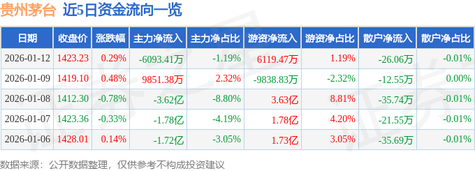 证券之星消息,截至2026年1月12日收盘,贵州茅台(600519)报收于1423.23元,上涨0.29%,换手率0.29%,成交量3.61万手,成交额51.36亿元。