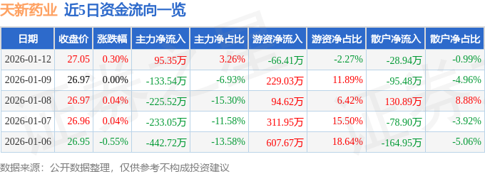 证券之星消息,截至2026年1月12日收盘,天新药业(603235)报收于27.05元,上涨0.3%,换手率0.25%,成交量1.09万手,成交额2929.03万元。