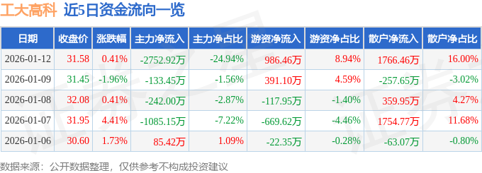 证券之星消息,截至2026年1月12日收盘,工大高科(688367)报收于31.58元,上涨0.41%,换手率3.99%,成交量3.5万手,成交额1.1亿元。