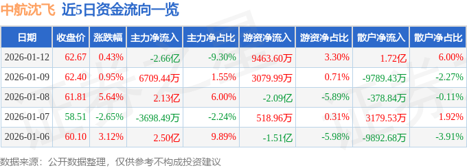 证券之星消息,截至2026年1月12日收盘,中航沈飞(600760)报收于62.67元,上涨0.43%,换手率1.63%,成交量46.02万手,成交额28.65亿元。