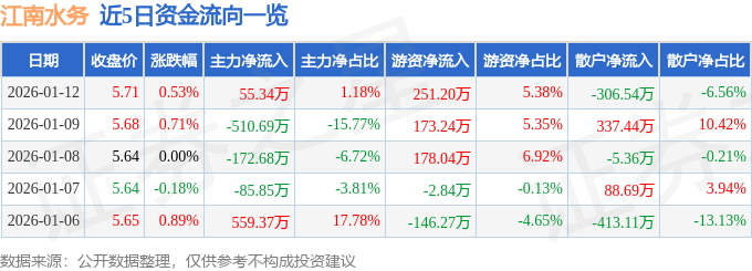 证券之星消息,截至2026年1月12日收盘,江南水务(601199)报收于5.71元,上涨0.53%,换手率0.88%,成交量8.24万手,成交额4671.8万元。