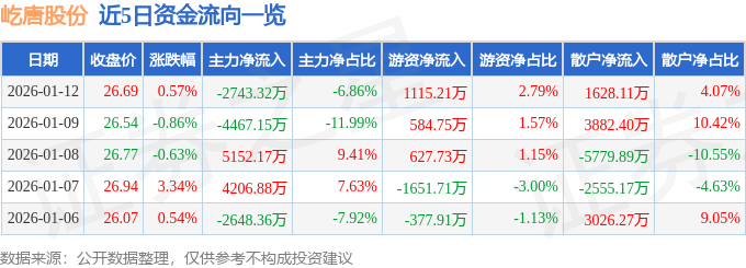 1月12日的资金流向数据方面,主力资金净流出2743.32万元,占总成交额6.86%,游资资金净流入1115.21万元,占总成交额2.79%,散户资金净流入1628.11万元,占总成交额4.07%。