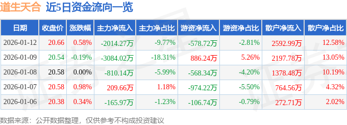 证券之星消息,截至2026年1月12日收盘,道生天合(601026)报收于20.66元,上涨0.58%,换手率9.4%,成交量10.07万手,成交额2.06亿元。