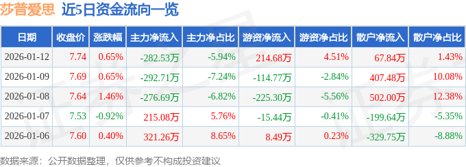 1月12日的资金流向数据方面,主力资金净流出282.53万元,占总成交额5.94%,游资资金净流入214.68万元,占总成交额4.51%,散户资金净流入67.84万元,占总成交额1.43%。