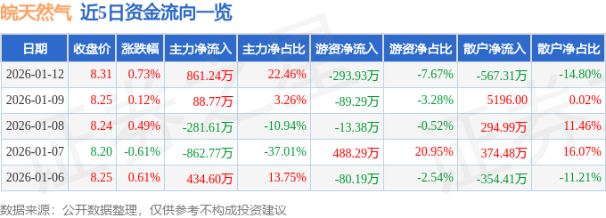 证券之星消息,截至2026年1月12日收盘,皖天然气(603689)报收于8.31元,上涨0.73%,换手率0.89%,成交量4.62万手,成交额3834.3万元。