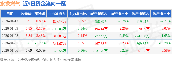 证券之星消息,截至2026年1月12日收盘,水发燃气(603318)报收于6.91元,上涨0.88%,换手率2.51%,成交量11.53万手,成交额7904.9万元。