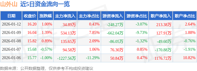 证券之星消息,截至2026年1月12日收盘,山外山(688410)报收于16.2元,上涨1.0%,换手率1.57%,成交量5.0万手,成交额8097.59万元。