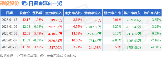 1月12日的资金流向数据方面,主力资金净流入919.27万元,占总成交额3.64%,游资资金净流入1.76万元,占总成交额0.01%,散户资金净流出921.03万元,占总成交额3.65%。
