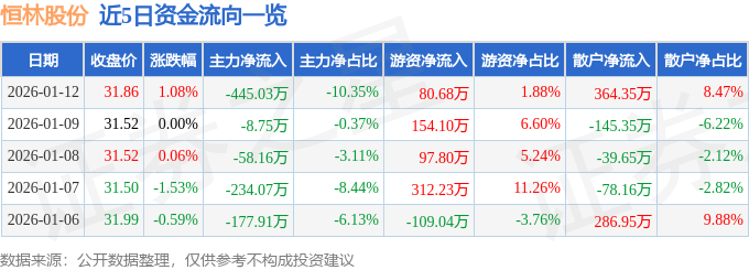 证券之星消息,截至2026年1月12日收盘,恒林股份(603661)报收于31.86元,上涨1.08%,换手率0.97%,成交量1.35万手,成交额4299.56万元。