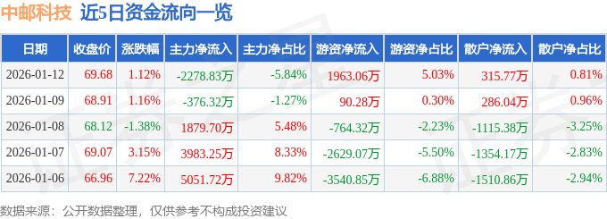 证券之星消息,截至2026年1月12日收盘,中邮科技(688648)报收于69.68元,上涨1.12%,换手率8.29%,成交量5.76万手,成交额3.9亿元。