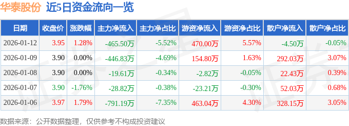 证券之星消息,截至2026年1月12日收盘,华泰股份(600308)报收于3.95元,上涨1.28%,换手率1.42%,成交量21.49万手,成交额8436.31万元。