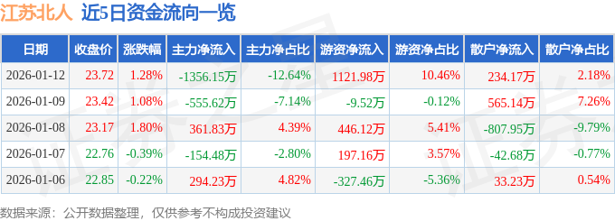 证券之星消息,截至2026年1月12日收盘,江苏北人(688218)报收于23.72元,上涨1.28%,换手率3.84%,成交量4.55万手,成交额1.07亿元。