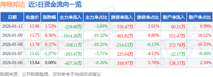 证券之星消息,截至2026年1月12日收盘,海程邦达(603836)报收于13.96元,上涨1.53%,换手率2.15%,成交量4.41万手,成交额6108.57万元。