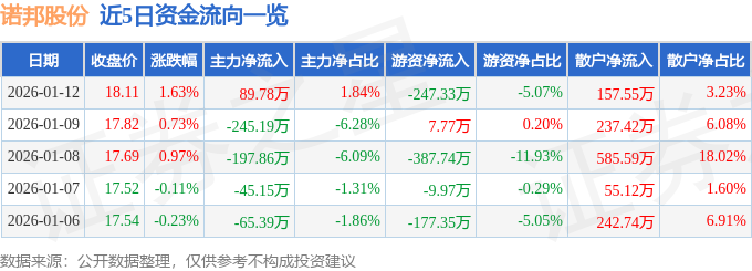 证券之星消息,截至2026年1月12日收盘,诺邦股份(603238)报收于18.11元,上涨1.63%,换手率1.53%,成交量2.71万手,成交额4881.98万元。