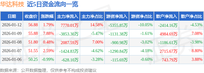 证券之星消息,截至2026年1月12日收盘,华达科技(603358)报收于56.88元,上涨1.79%,换手率2.1%,成交量9.45万手,成交额5.33亿元。
