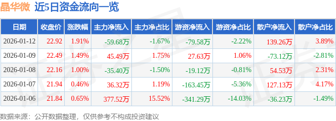 证券之星消息,截至2026年1月12日收盘,晶华微(688130)报收于22.92元,上涨1.91%,换手率2.59%,成交量1.56万手,成交额3581.19万元。