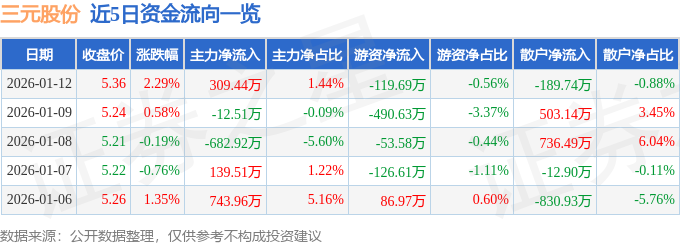 证券之星消息,截至2026年1月12日收盘,三元股份(600429)报收于5.36元,上涨2.29%,换手率2.7%,成交量40.48万手,成交额2.15亿元。