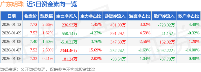 证券之星消息,截至2026年1月12日收盘,广东明珠(600382)报收于7.72元,上涨2.66%,换手率3.06%,成交量21.28万手,成交额1.63亿元。