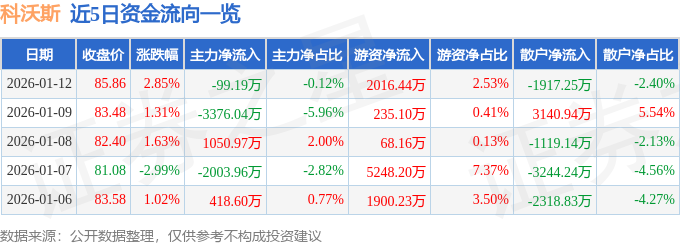 1月12日的资金流向数据方面,主力资金净流出99.19万元,占总成交额0.12%,游资资金净流入2016.44万元,占总成交额2.53%,散户资金净流出1917.25万元,占总成交额2.4%。