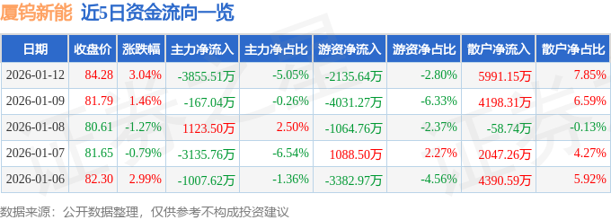 证券之星消息,截至2026年1月12日收盘,厦钨新能(688778)报收于84.28元,上涨3.04%,换手率1.79%,成交量9.03万手,成交额7.63亿元。