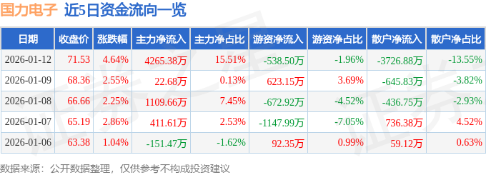 证券之星消息,截至2026年1月12日收盘,国力电子(688103)报收于71.53元,上涨4.64%,换手率4.11%,成交量3.92万手,成交额2.75亿元。