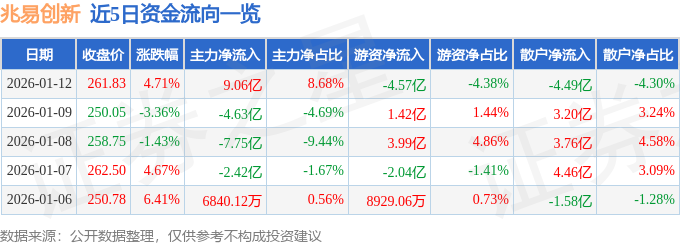 证券之星消息,截至2026年1月12日收盘,兆易创新(603986)报收于261.83元,上涨4.71%,换手率6.05%,成交量40.38万手,成交额104.36亿元。