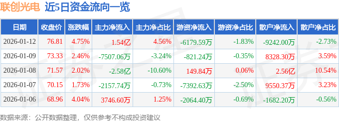 证券之星消息,截至2026年1月12日收盘,联创光电(600363)报收于76.81元,上涨4.75%,换手率10.03%,成交量45.22万手,成交额33.84亿元。