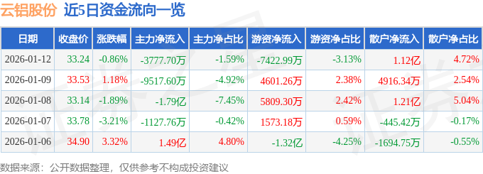 证券之星消息,截至2026年1月12日收盘,云铝股份(000807)报收于33.24元,下跌0.86%,换手率2.04%,成交量70.8万手,成交额23.75亿元。