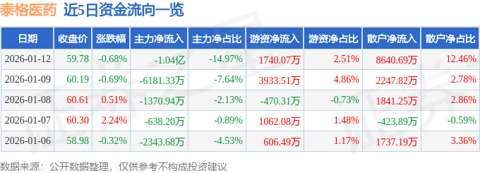 证券之星消息,截至2026年1月12日收盘,泰格医药(300347)报收于59.78元,下跌0.68%,换手率2.04%,成交量11.56万手,成交额6.93亿元。
