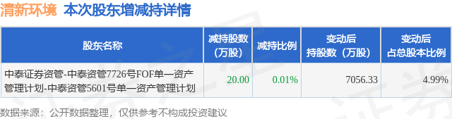 证券之星消息,1月12日清新环境发布公告《清新环境:关于持股5%以上股东减持计划期限届满暨实施情况的公告》,其股东中泰证券资管-中泰资管7726号FOF单一资产管理计划-中泰资管5601号单一资产管理计划于2025年10月16日至2026年1月9日间合计减持20.0万股,占公司目前总股本的0.0141%,变动期间该股股价下跌3.54%,截止1月9日收盘报3.81元。