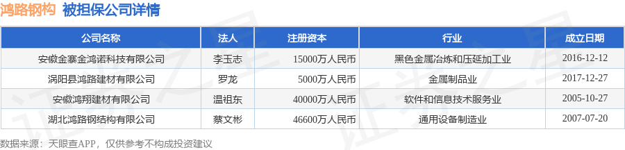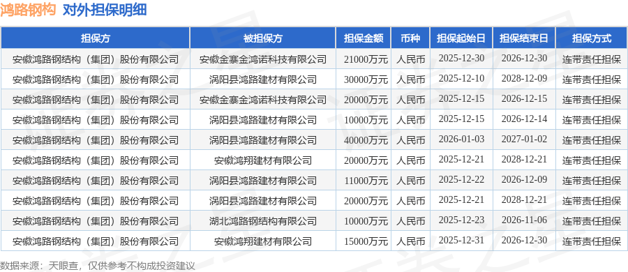 鸿路钢构1月9日披露10笔对外担保,被担保公司4家。对外担保明细如下表: