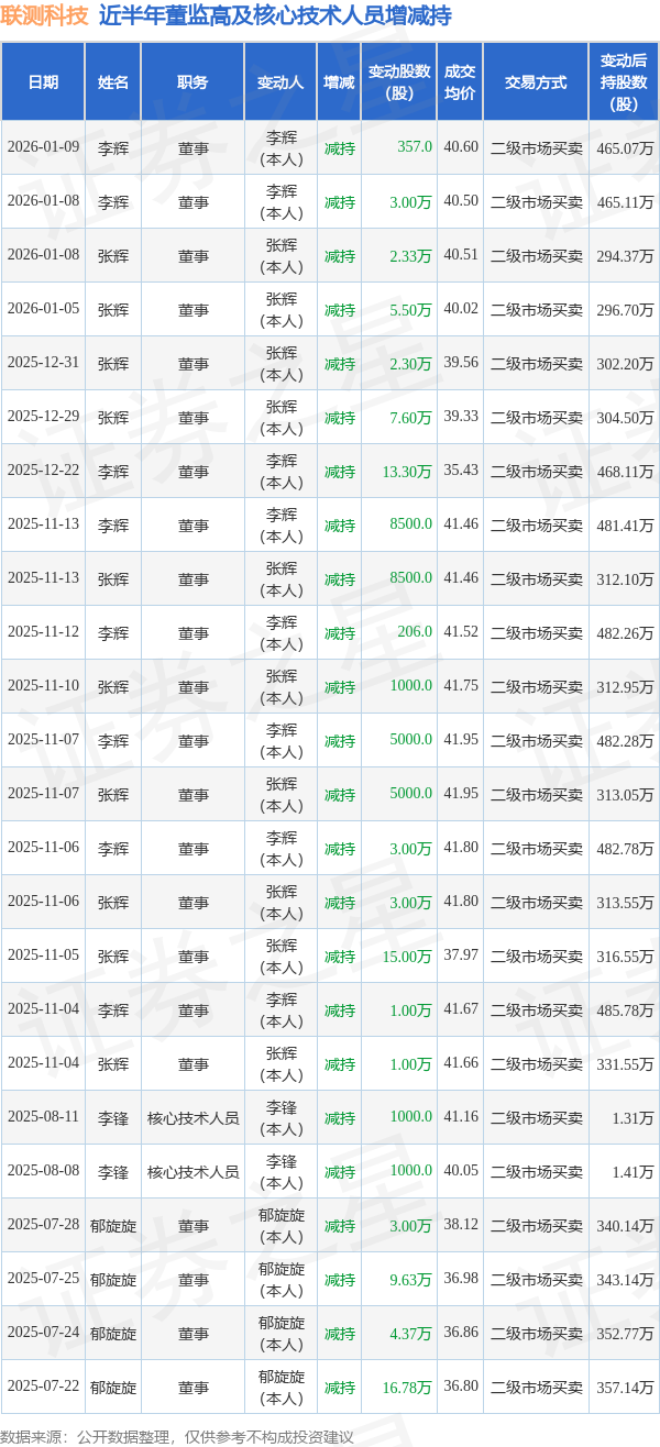 联测科技近半年内的董监高及核心技术人员增减持详情如下: